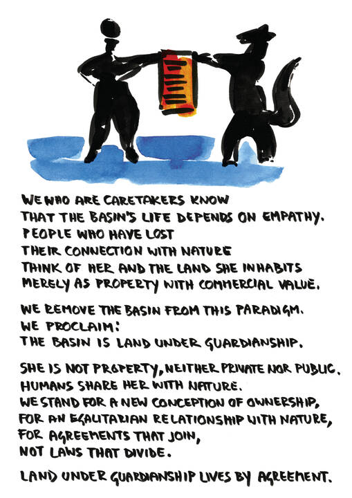 Marjetica Potrč, The Basin Case Study: On Coexistence, 2023, drawing No.8 of 11 drawings. Ink on paper. Courtesy of the artist and Galerie Nordenhake, Berlin/Stockholm/Mexico City.